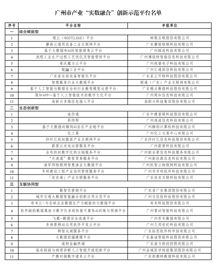 3月4日,广州市政务服务和数据管理局举行产业“实数融合”创新示范平台遴选结果发布会,包括树根互联、南方财经、金域医学等在内的首批33家产业“实数融合”创新示范平台入选,涵盖工程、制造、交通、贸易、教育、医药等重点产业。