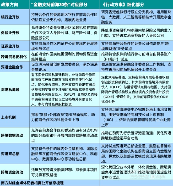 南方财经全媒体记者梳理发现,相较 “金融支持前海30条”,“行动方案”在政策上进行扩面增量,对金融开放、深港私募通、赴港上市等路径予以明确。例如,从“设立前海功能性总部”到“探索深港双总部模式”,从“有序探索私募通”到“深化私募通”,从“助力科创企业上市”到明确“用好‘18C’机制赴港上市”等多处,都体现出“行动方案”在两年后的政策细化与加码。